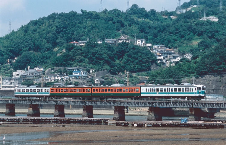 | ▲呉線の黒瀬川鉄橋を渡る阪和色+湘南色の混色編成。他編成との併結がない121・122運用に隔日充当され、朝夕の運用が中心だったが、日中にも呉線広島〜広を1往復する運用があり、ちょうど黒瀬川鉄橋を光線状態のよい時間帯に通過していた。 【注意】この場所は堤防の嵩上げ工事が行われたため、構図が限定されるようになりました。また、バックにマンションが新築されました。 |
